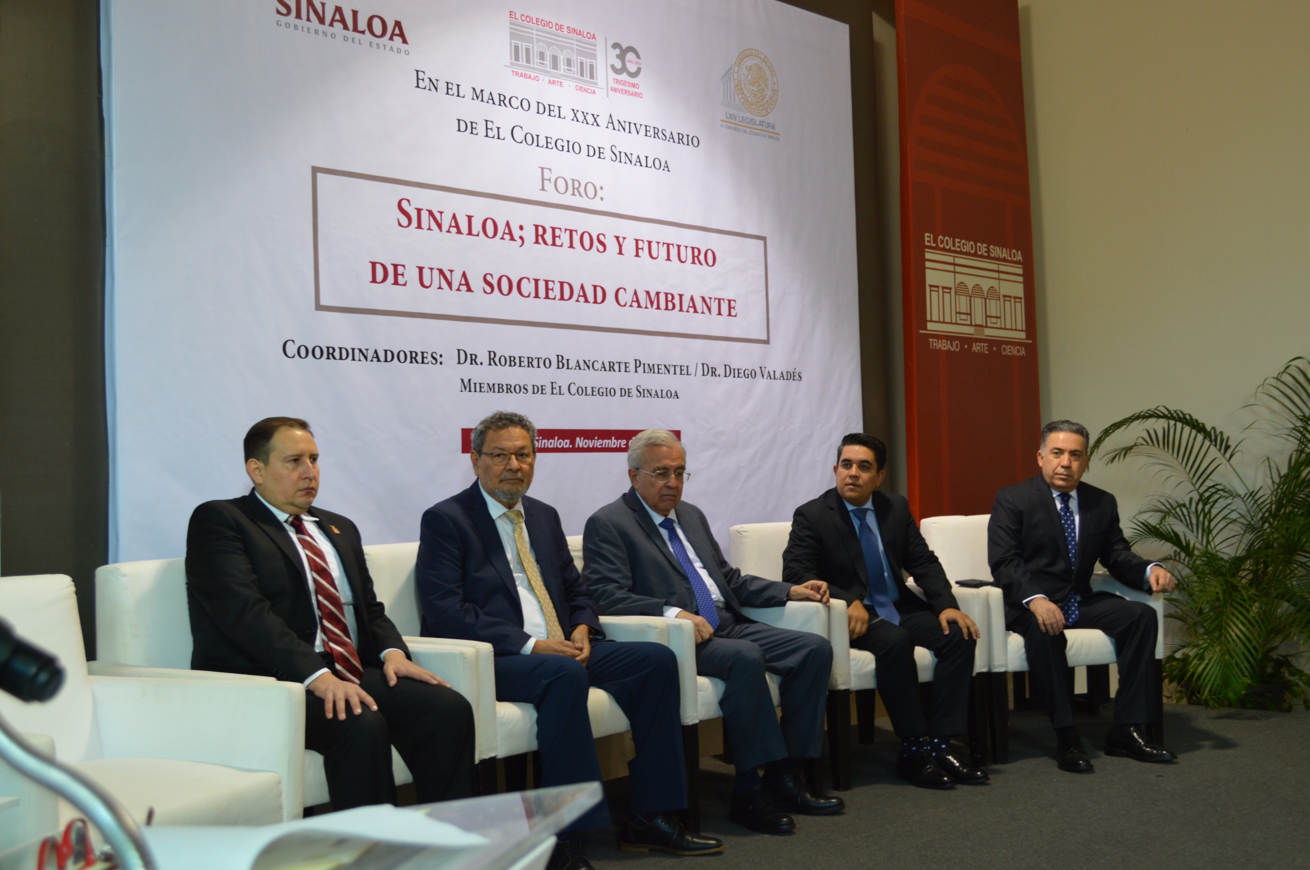 Como parte del programa académico por el XXX aniversario de su fundación, El Colegio de Sinaloa inauguró el Foro “Sinaloa; retos y futuro de una sociedad cambiante”, el miércoles 23 de noviembre del año en curso, en el vestíbulo de este organismo. En el acto inaugural asistieron el Dr. Rubén Rocha Moya, Gobernador Constitucional del Estado de Sinaloa; Dip. Ricardo Madrid Pérez, presidente de la Junta de Coordinación Política del H. Congreso del Estado; Mag. Jesús Iván Chávez Rangel, presidente del Supremo Tribunal de Justicia;