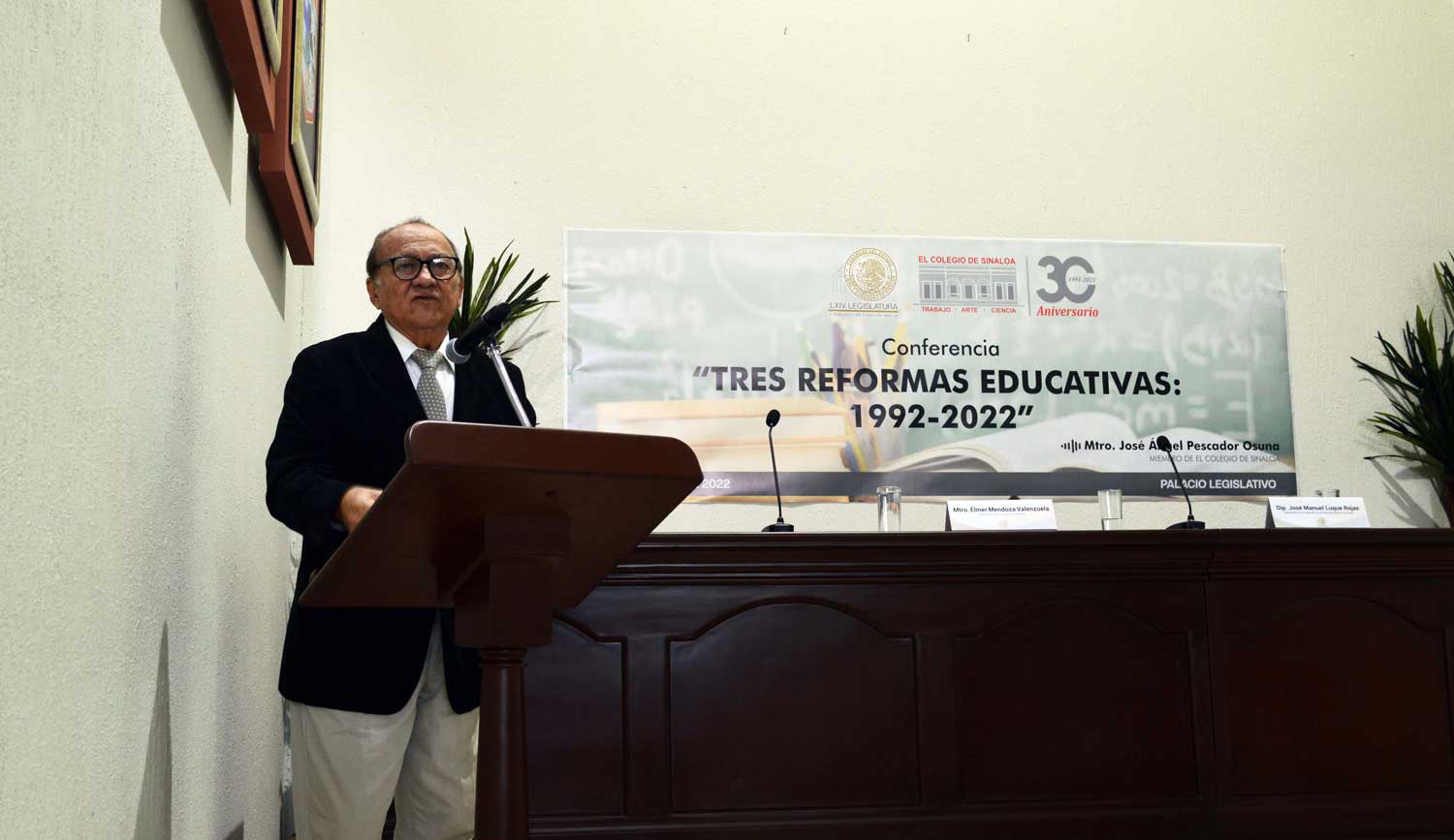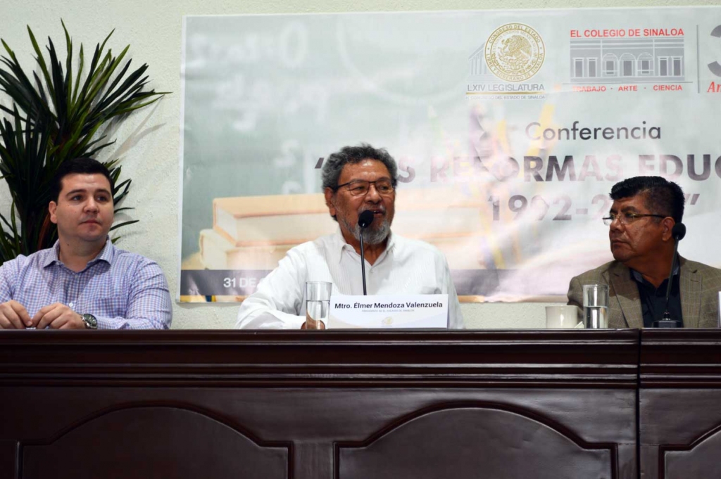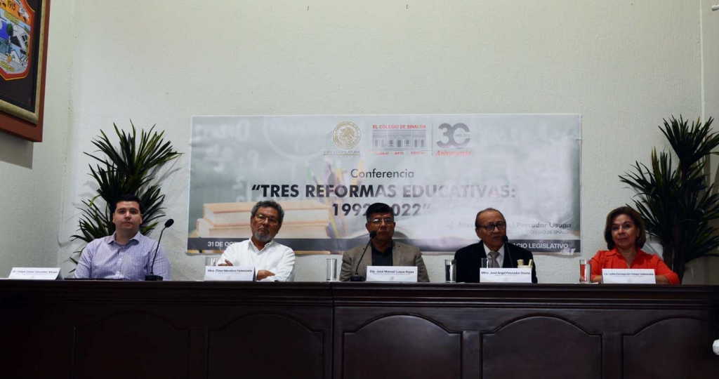 Con el objetivo de analizar el avance de la educación en México, el Mtro. José Ángel Pescador Osuna ofreció la conferencia Tres reformas educativas 1992-2022, en el H. Congreso del Estado de Sinaloa, como parte del ciclo de conferencias organizado entre El Colegio de Sinaloa y el poder legislativo, el lunes 31 de octubre del presente año. Estuvieron presentes el Dip. José Manuel Luque, presidente de la Comisión de Educación; Mtro. Élmer Mendoza y Lic. Concepción Celaya, presidente y secretaria general de El Colegio de Sinaloa, respectivamente, así como al Dr. Felipe González Morga, director del Instituto de Investigaciones Parlamentarias.