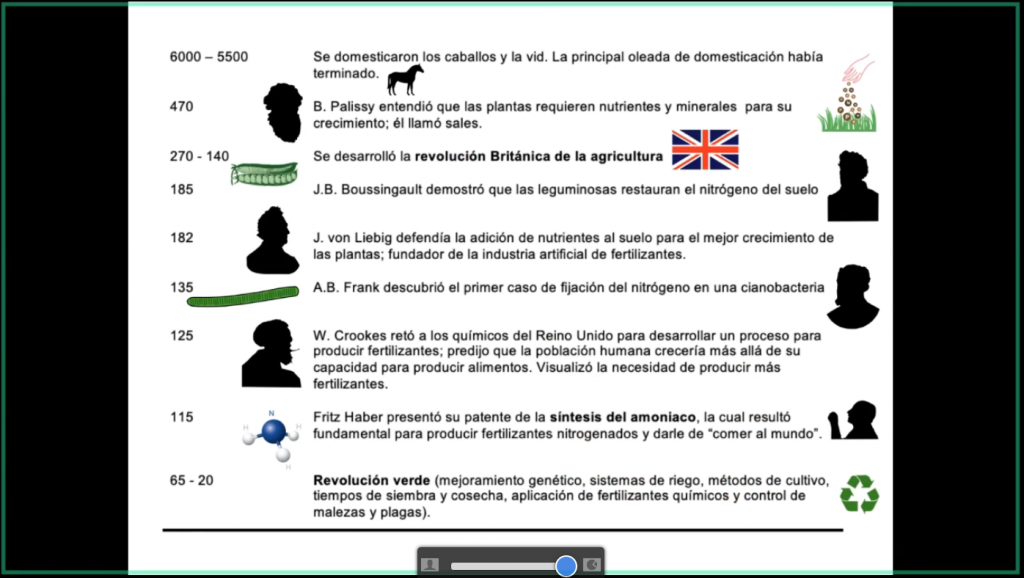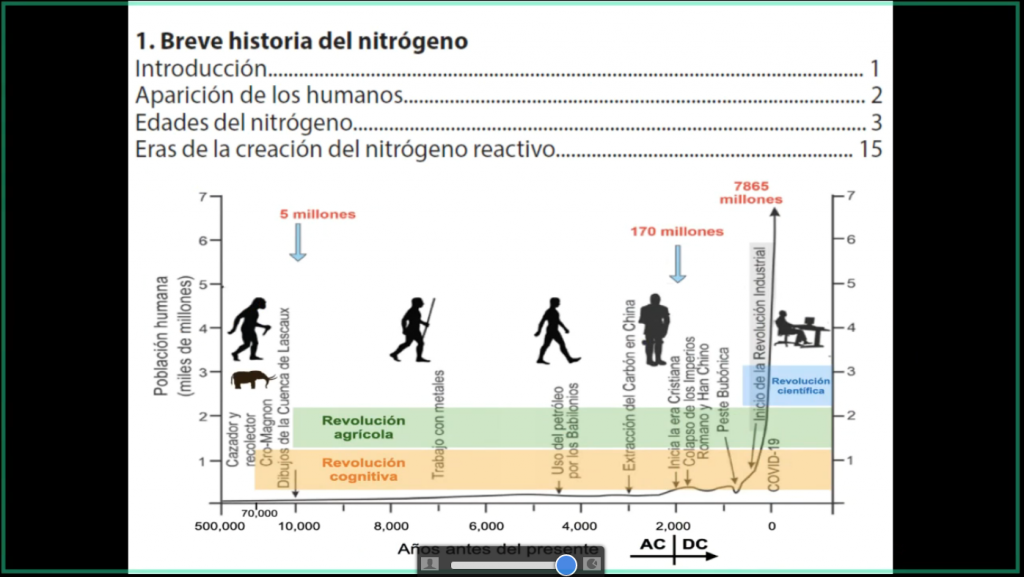Por medio de diapositivas, el Dr. Páez compartió ampliamente el contenido de esta obra de divulgación. En el capítulo I expuso una breve historia sobre el nitrógeno, la aparición de los humanos, así como las edades del nitrógeno y lo que se conoce como las eras de la creación del nitrógeno reactivo. En el capítulo II se discuten todos estos factores que inciden en la producción de alimentos; donde la conclusión a la que llega la UNESCO es producir más alimento con menos agua y tierra.
