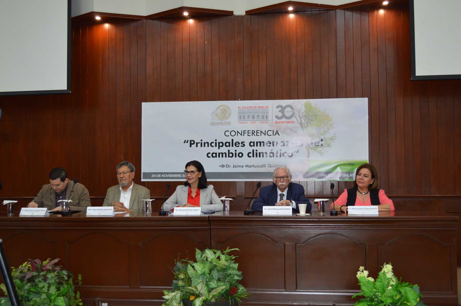 Con la conferencia “Principales amenazas del cambio climático”, el Dr. Jaime Martuscelli Quintana —miembro de El Colegio de Sinaloa— participó en el ciclo de actividades coordinadas con el H. Congreso del Estado, el pasado jueves 24 de noviembre del presente año, en el Salón Constituyentes de 1917 del recinto legislativo. En el evento académico estuvo acompañado por la Dip. Giovanna Morachis Paperini, presidenta de la Comisión de Ecología y Desarrollo Sustentable; así como el presidente de El Colegio de Sinaloa, Mtro. Élmer Mendoza, entre otros directivos de ambos organismos.