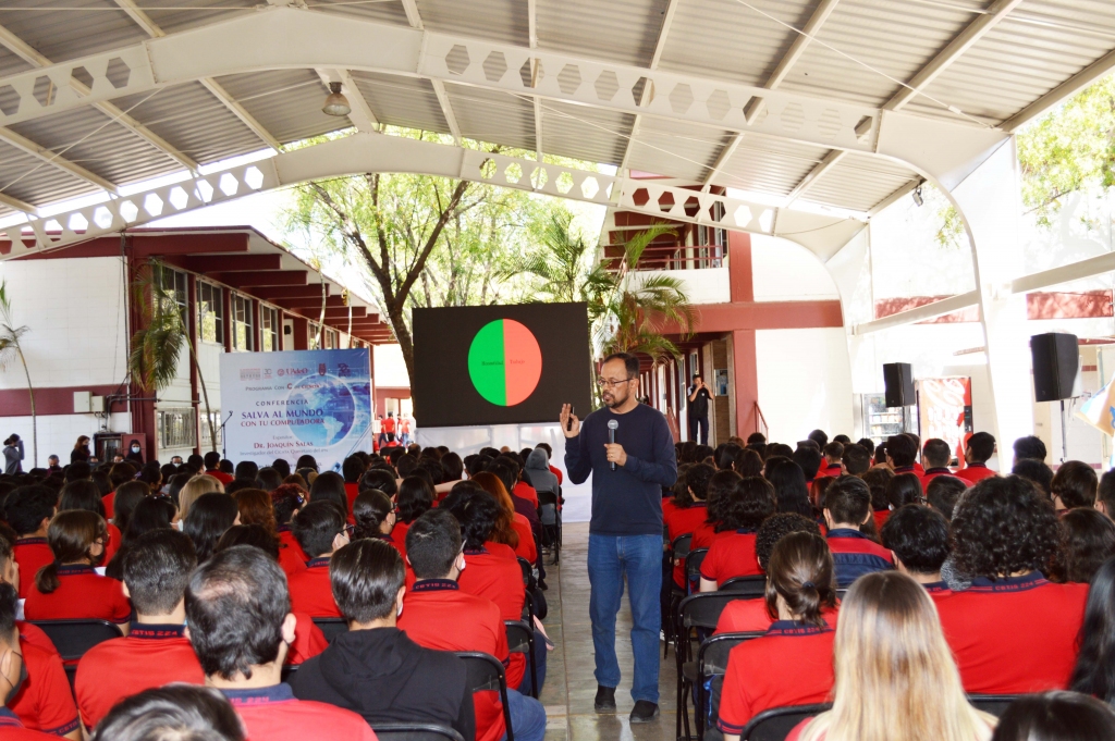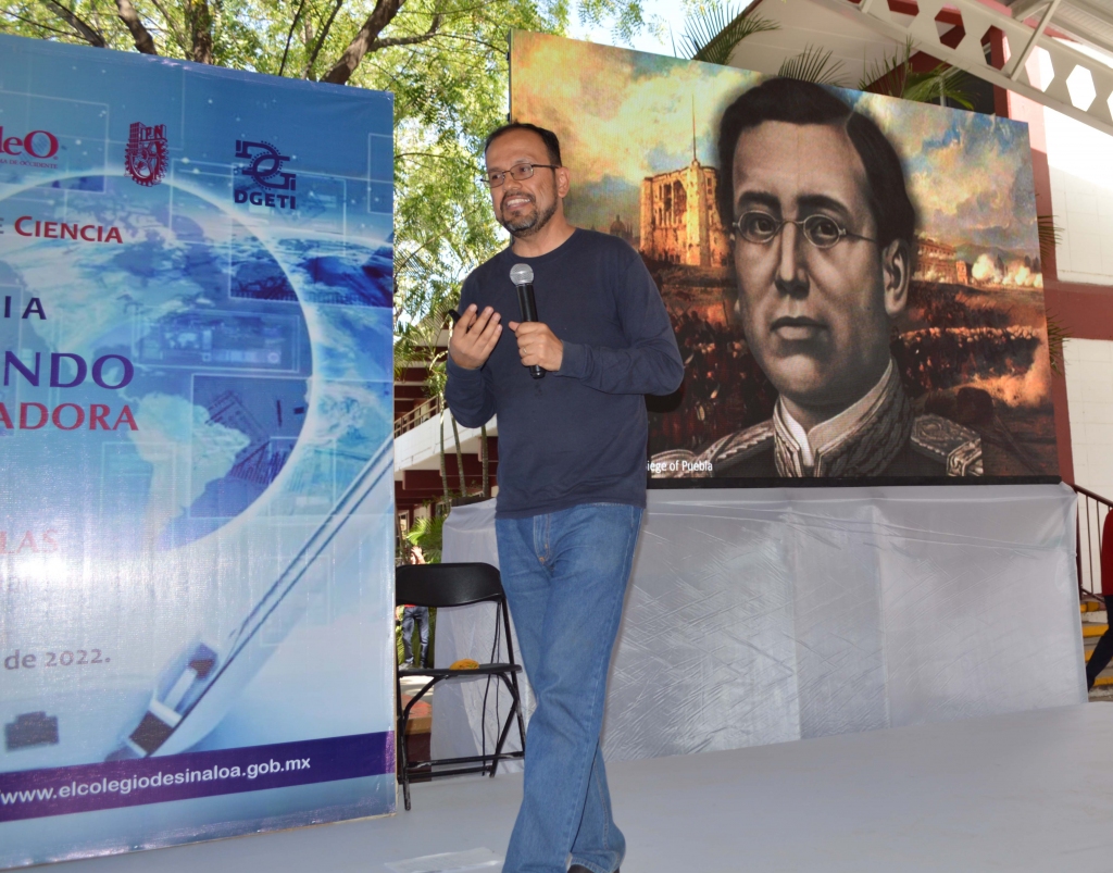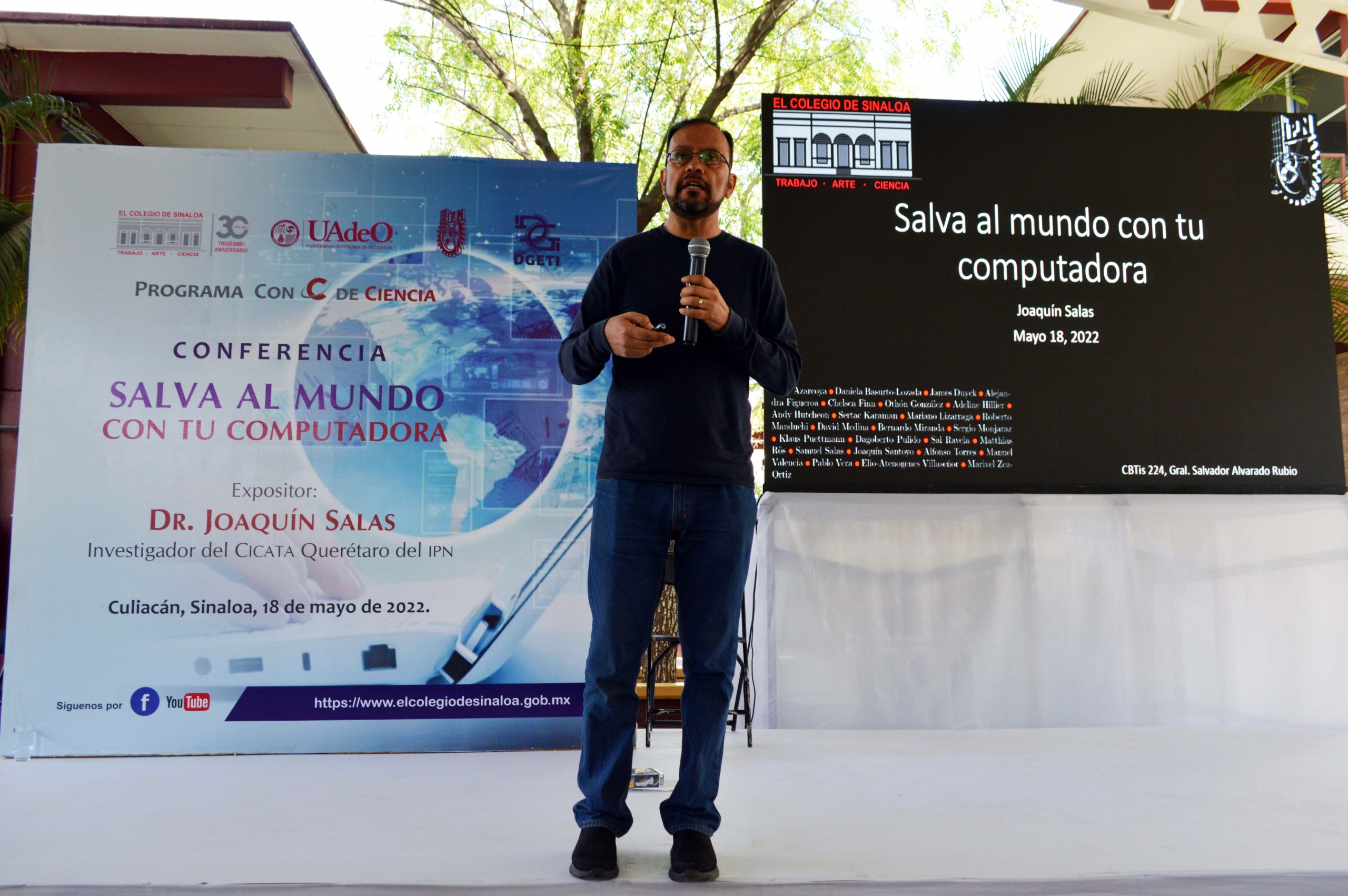 Invitado por El Colegio de Sinaloa para impartir la conferencia Salva al mundo con tu computadora como parte del programa Con C de Ciencia, el reconocido científico Dr. Joaquín Salas —investigador del CICATA-IPN, con sede en Querétaro— compartió sus experiencias en el desarrollo de diversos softwares y aplicaciones que son utilizados en modelado de climas, pérdida de biodiversidad, cambio climático, entre otras, donde la presencia humana ha sido fundamental como factor determinante de esta ecuación. La actividad tuvo lugar este miércoles 18 de mayo del presente año, en las instalaciones del CBTIS 224, con la asistencia de alrededor de 400 estudiantes.