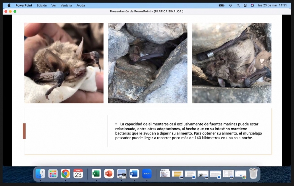 Para finalizar, habló que el murciélago pescador posee riñones que le permiten producir orina concentrada y conservar el agua que obtiene de su alimento, así enfrenta las condiciones del desierto que habita. Mientras que en el invierno, entra en torpor, es decir, en un estado donde se disminuyen los niveles metabólicos y la temperatura corporal. El aspecto de su alimentación por fuentes marinas es una de las características más relevantes. Para esto, compartió que poseen una microbiota que ayuda a digerir su alimento y son una de las cuatro especies que tienen las bacterias para poder alimentarse de estas fuentes; también mencionó que llegan a recorrer poco más de 140 km para obtener su alimento, en una sola noche.