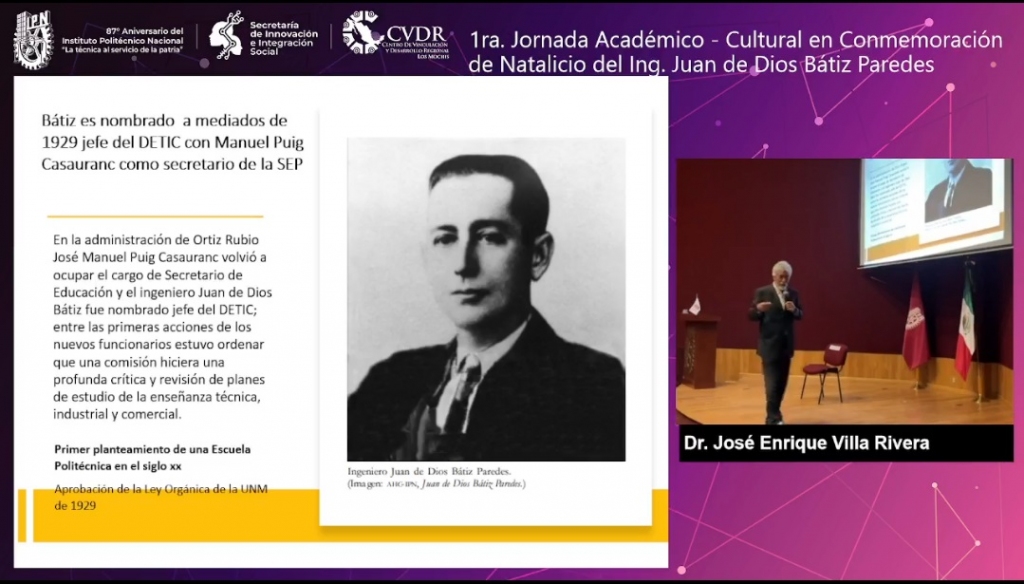 Una vez detallados algunos trazos históricos de la creación del IPN, Villa Rivera presentó el trazo que recorrió Bátiz hasta el momento en que se cruzaron ambos caminos. Señaló que Juan de Dios Bátiz fue nombrado, en 1929, jefe del DETIC con Manuel Puig Casauranc como secretario de la SEP, comentó que “lo que hace Bátiz justamente en ese poco tiempo que tuvo en la DETIC, de 1929 a 1931, fue hacer el primer planteamiento del siglo XX de la Escuela Politécnica Nacional”. Agregó que el planteamiento inicial era darle congruencia a la educación técnica, establecer un modelo pedagógico, es decir, dar un ‘ordenamiento’, concepto que engloba a la Escuela Politécnica Nacional.