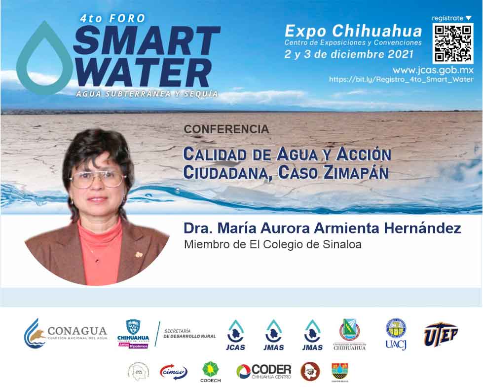 Como invitada en el 4° Congreso Internacional Smart Water, la Dra. María Aurora Armienta Hernández —miembro de El Colegio de Sinaloa— disertó la conferencia Calidad de Agua y Acción Ciudadana, Caso Zimapán. El evento se llevó a cabo el 2 y 3 de diciembre de manera presencial en el Centro de Convenciones y Exposiciones de Chihuahua, y de forma virtual a través de plataformas digitales.